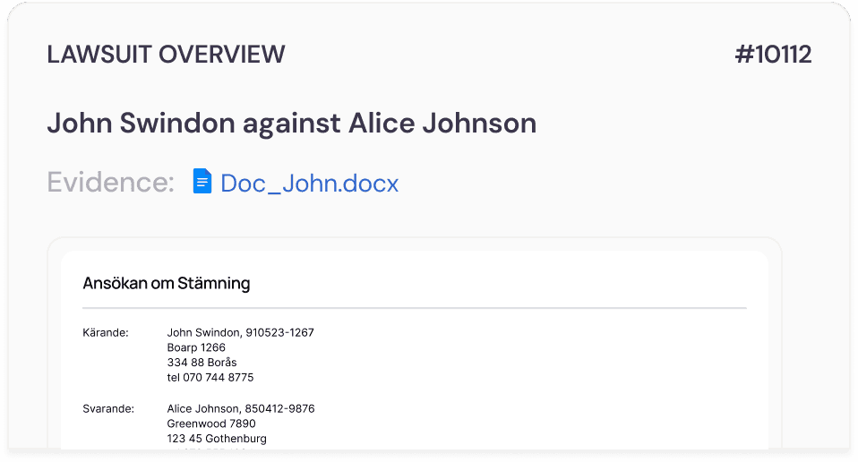 Ladda upp dina ärendefiler och få färdiga stämningar, svaromål och yttranden.