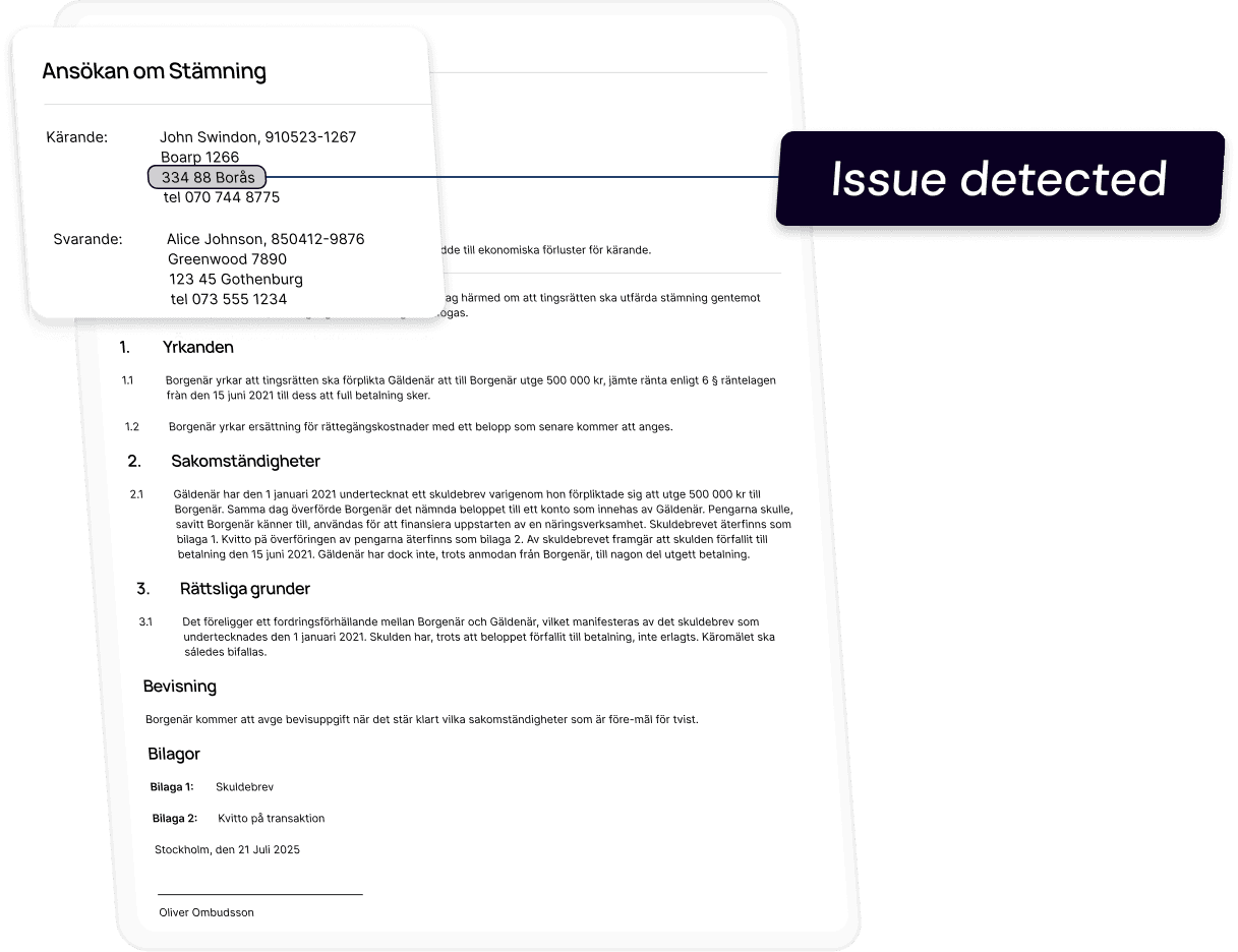 Minska fel i hänvisningar, belopp och datum – varje utkast förankrat i svensk lag.